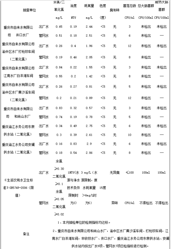 2017年1月,重慶市供水處對我市2家供水企業(yè)的7個水廠進行了水質(zhì)監(jiān)測。結(jié)果表明,本月抽檢單位的檢測指標(biāo)均達標(biāo)。重慶市自來水有限公司和尚山水廠,渝中區(qū)水廠黃沙溪車間、打槍壩車間,江南水廠白洋灘車間,豐收壩水廠、井口水廠,重慶渝江水務(wù)公司東泉供水站、安瀾供水站均按出廠水9項、管網(wǎng)水7項日檢指標(biāo)進行檢測。