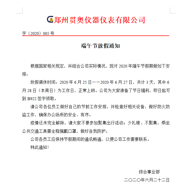 2020端午佳節(jié)將至,首先向鄭州貫奧儀器儀表有限公司全體員工及家人致以節(jié)日誠(chéng)摯的問候。