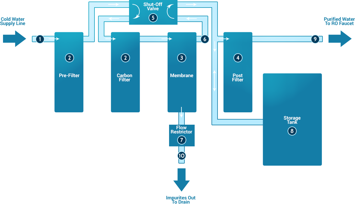 后過濾器: 水離開RO儲罐后,但在進入RO水龍頭之前,處理后的水經(jīng)過最終的“后過濾器”。后過濾器通常是碳過濾器。通過后過濾“拋光”過濾器,從產(chǎn)品水中除去任何剩余的味道或氣味。