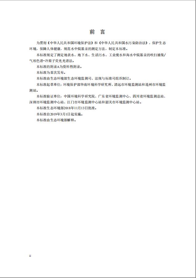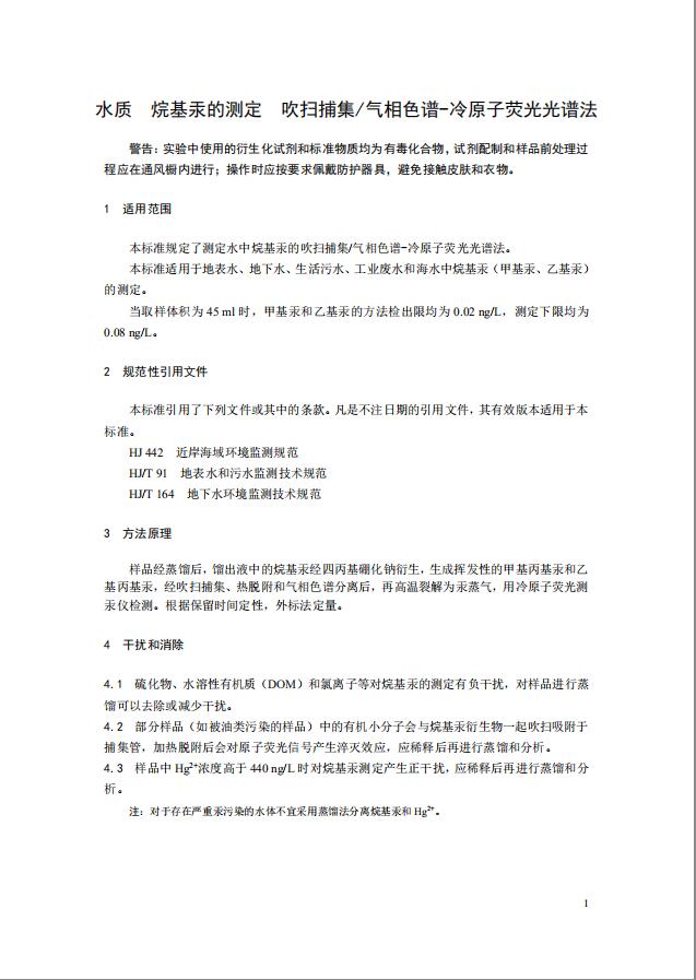 本標(biāo)準(zhǔn)規(guī)定了地表水測(cè)定、地下水測(cè)定、生活污水檢測(cè)、工業(yè)廢水檢測(cè)和海水中烷基汞的吹掃捕集/氣相色譜-冷原子熒光光譜法。本標(biāo)準(zhǔn)的附錄A為資料性附錄。 本標(biāo)準(zhǔn)為首次發(fā)布。